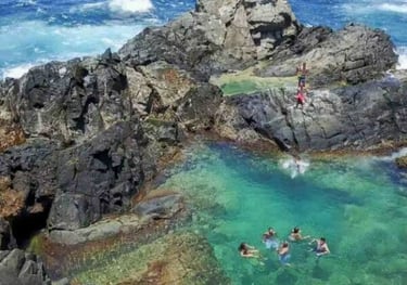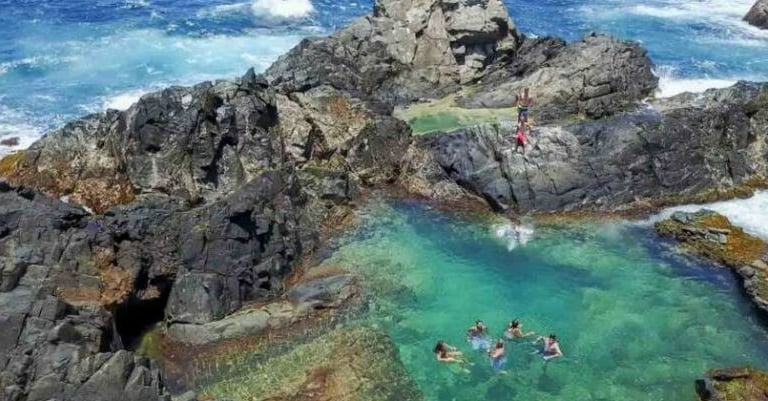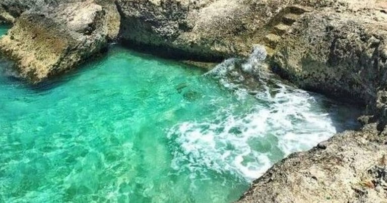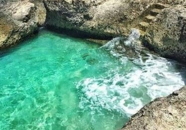 The Natural Pool, or 'conchi,' nestled in the remote east of Aruba, is a pristine oasis surrounded by rugged terrain. Accessible only by 4WD, ATVs, horseback, or foot, it's a hidden gem formed by rock and volcanic stone circles.