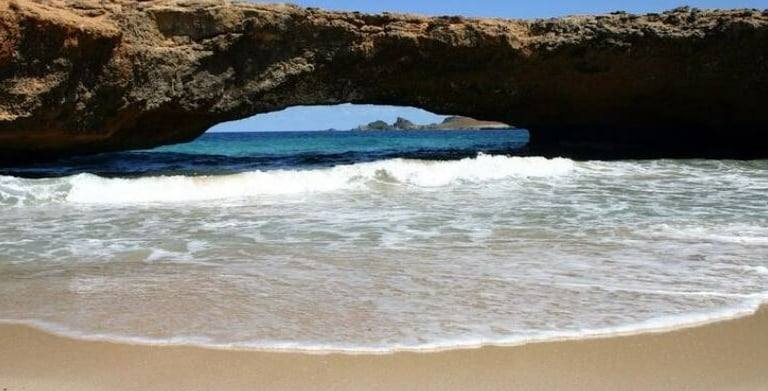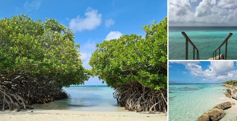 Tres Trapi, translating to 'three steps,' is a picturesque cove on Aruba's rocky northwest shore. Accessible by rustic rock-carved steps, this 10-meter beach boasts white sand, grey cliffs, and serene waters—earning its reputation as one of the island's favorite and most photogenic snorkeling spots